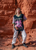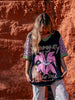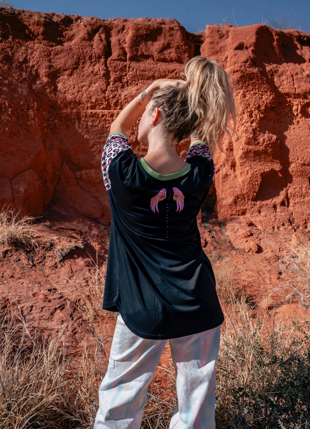 Super soft slouchy fit tee, contrast leopard print sleeves and an all seeing angel.